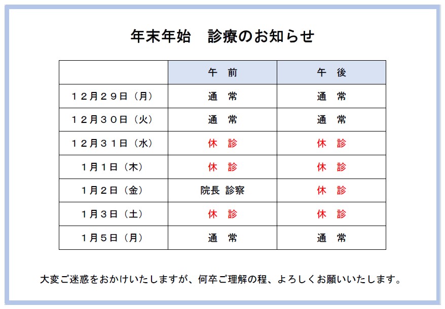 年始は1月2日(金)に院長の午前診のみ実施し、1月5日(月)より通常診療となります。